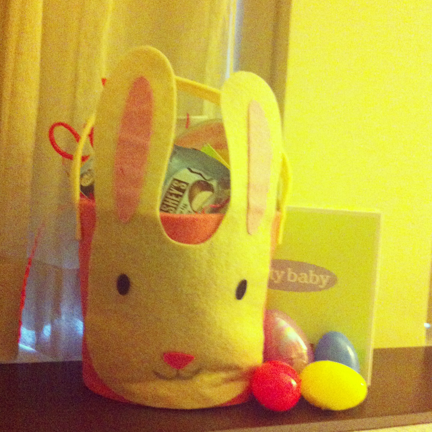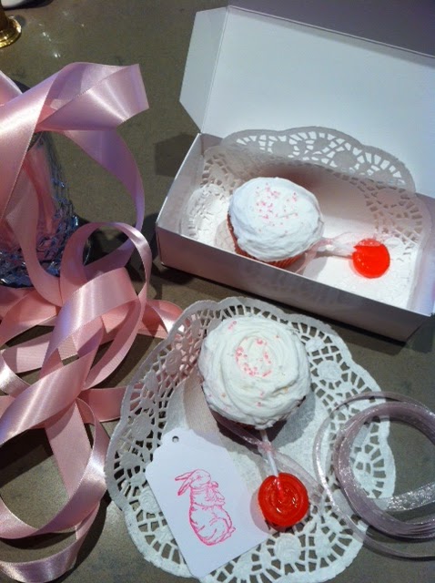 A cupcake rattle, all boxed up with a pink bow and cute bunny tag for each guest to take away.