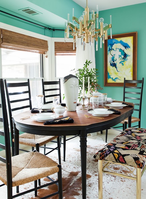 Erin also participated in the 6 week Design Challenge. She chose her dinette area & in my humble opinion, she knocked it out of the park again with her fearless use of colour & mixing of design styles. The bench fabric, the chandy & the hide are my faves.