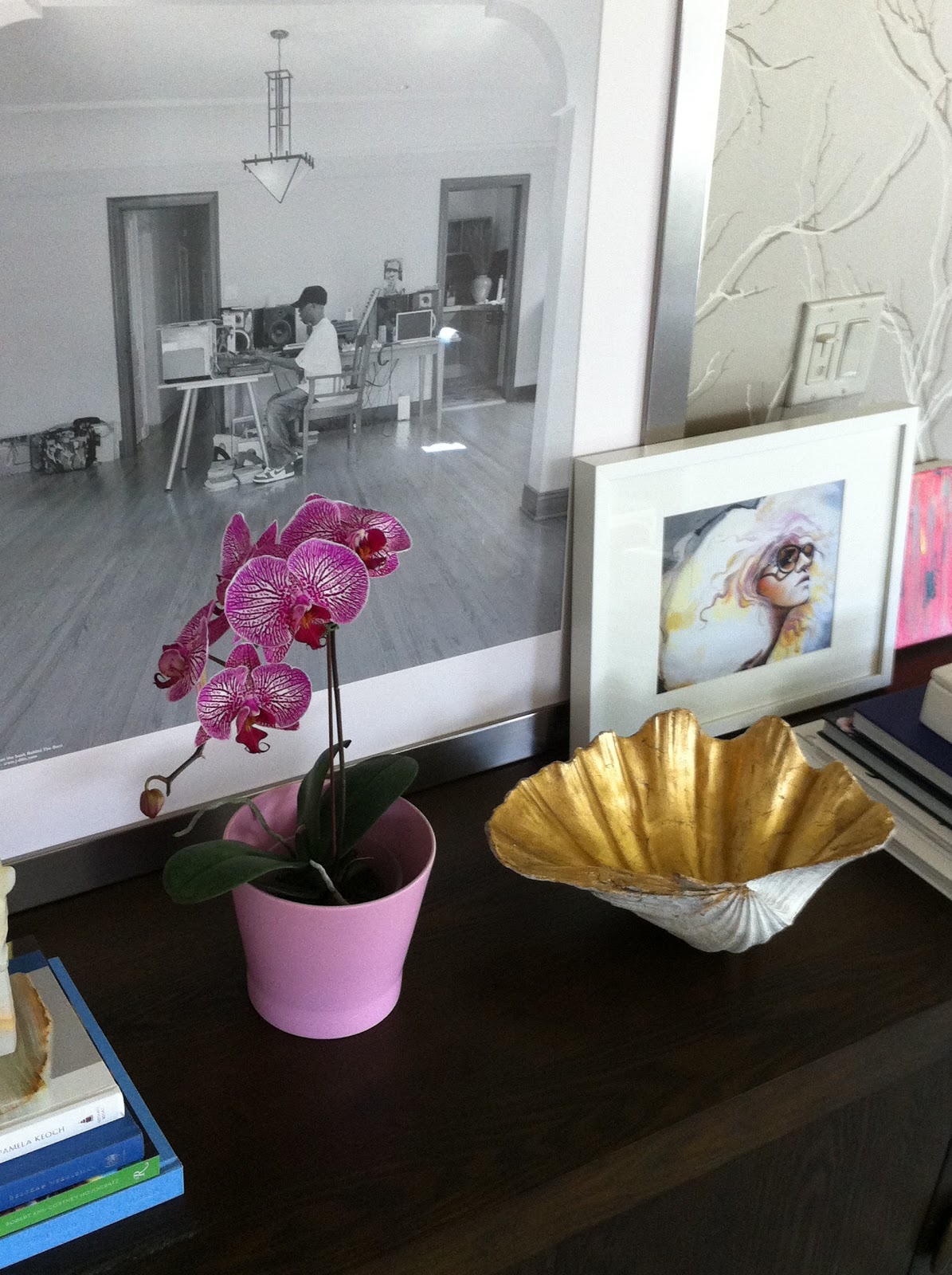 The furniture was moved last week when the sofa was delivered and the sideboard got shimmied into it’s new spot. I styled it, using what I had from different areas in the house. I’m unsure about the large picture, but I like how it balances out all the feminine, so until I decide, it’s just going to lean there.