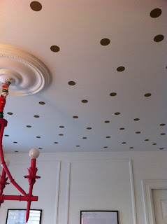 The 2″ gold polka dots from Walls Need Love, finally got up on the ceiling & I adore them.  I put them up at random & I love that they are not perfectly placed and in a pattern so to speak.