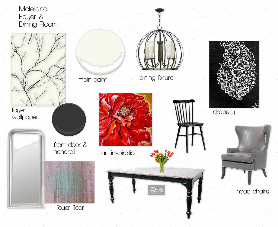 On the biz side of things, Project Deer Run is well on it’s way. The foyer wallpaper is ordered, and the marble for the floor is purchased, ready and waiting. A few revisions have been made. Here is the latest Foyer Dining Room board.